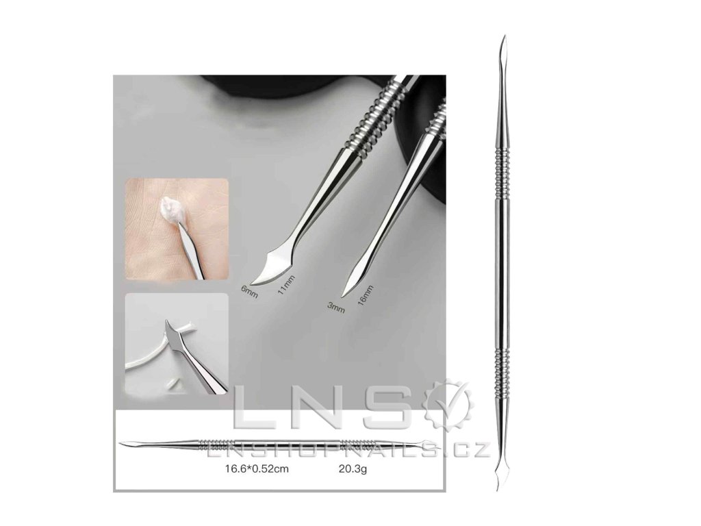 Vyroben z nerezové oceli, má ostrý a plochý konec – ideální pro čištění kůžičky i tvarování 3D květin.