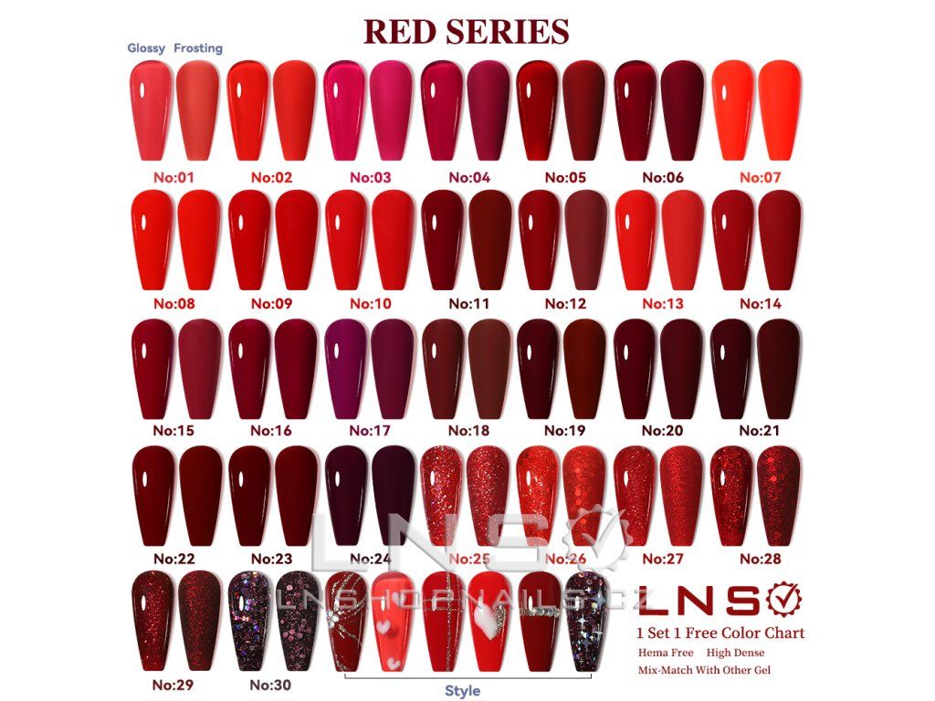 Gel lak LNS Red Series je profesionální UV/LED gelový lak s širokou škálou červených odstínů od jasně červené po tmavě vínovou a třpytivou. Ideální pro nehtová studia a moderní design.