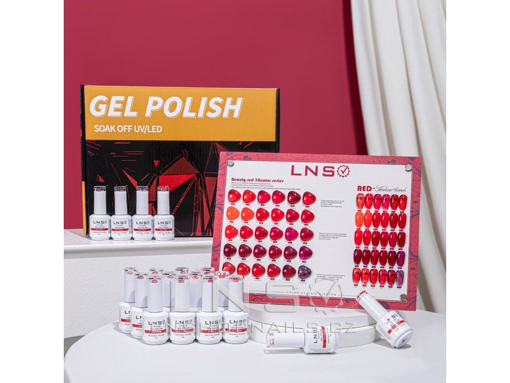 Gel lak LNS Red Series je profesionální UV/LED gelový lak s širokou škálou červených odstínů od jasně červené po tmavě vínovou a třpytivou. Ideální pro nehtová studia a moderní design.
