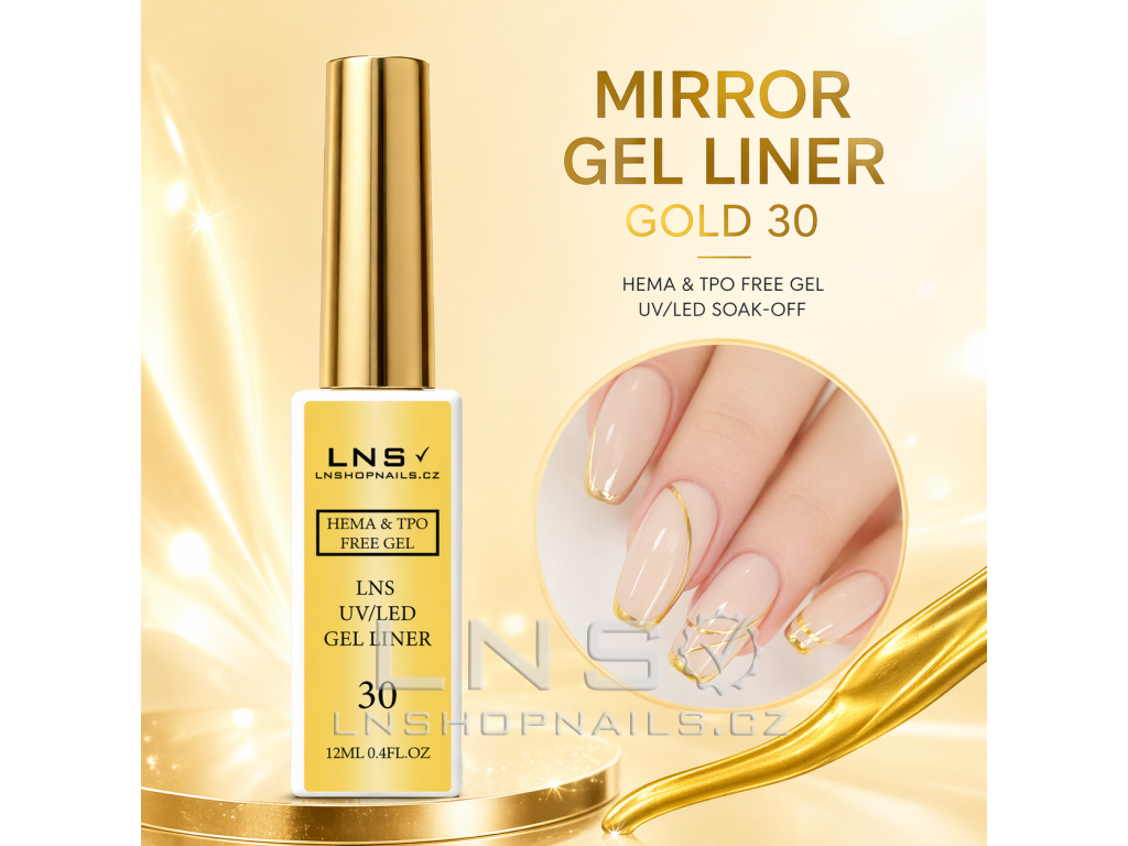 Metalický Gel Liner LNS vytváří precizní tenké linie s luxusním mirror efektem. Ideální pro French zdobení, ornamenty a profesionální nail art.