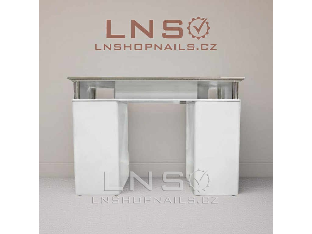 Bàn LNS M2 kích thước 115 × 51 × 78 cm, mặt đá trắng mỏng, sang trọng – tích hợp máy hút Turbo công suất 115W hút bụi siêu mạnh.